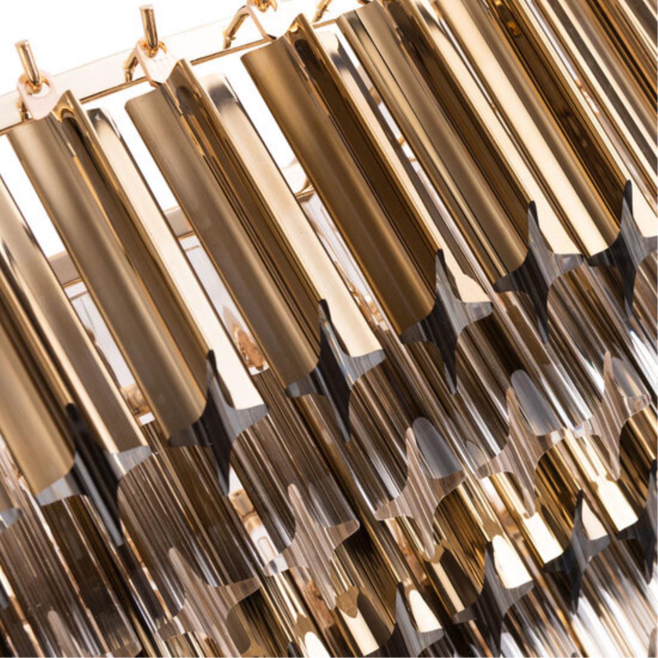 Свободно свисающие хрустальные декоративные элементы, расположенные в несколько рядов, образуют объемную конструкцию, которая при движении воздуха в помещении начинает «звучать». Сочетание золотых и прозрачных декоративных подвесок создают яркий, ослепительный образ модели. В коллекции четыре люстры разных размеров, есть возможность подобрать в помещения разных форматов. Большое бра может быть дополнением в ансамбль с люстрой, а может быть самостоятельным украшением интерьера.