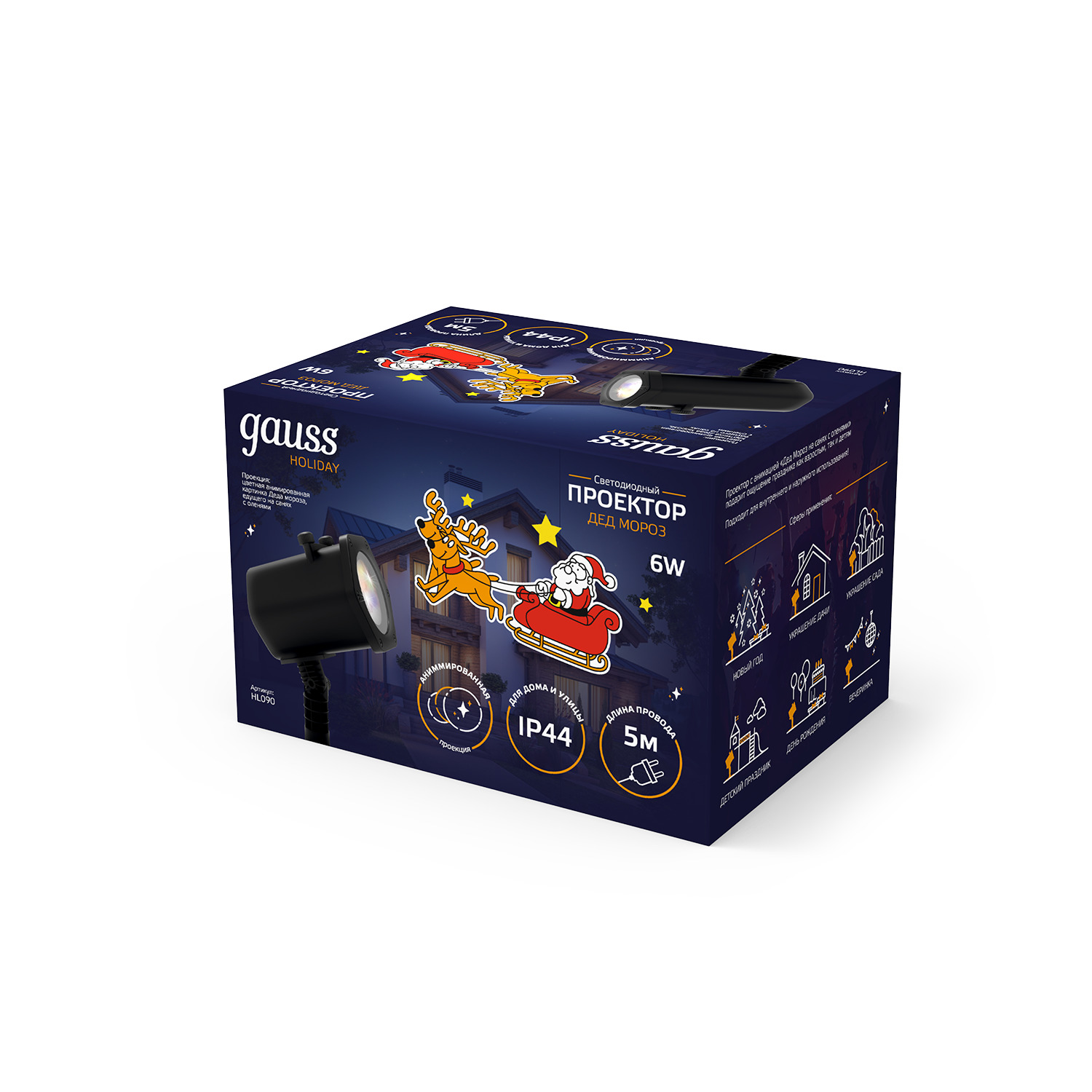 Лазерный новогодний проектор "Дед Мороз" создаст на стене, потолке, фасаде здания изображение главного персонажа, с которым у нас всегда ассоциируются желанные новогодние подарки – Дед Мороз и его верные олени. Проекция анимирована, Дед Мороз будет всегда мчать на санях. Воплощение новогодних чудес и праздника с проектором от Gauss – осуществимая задача.