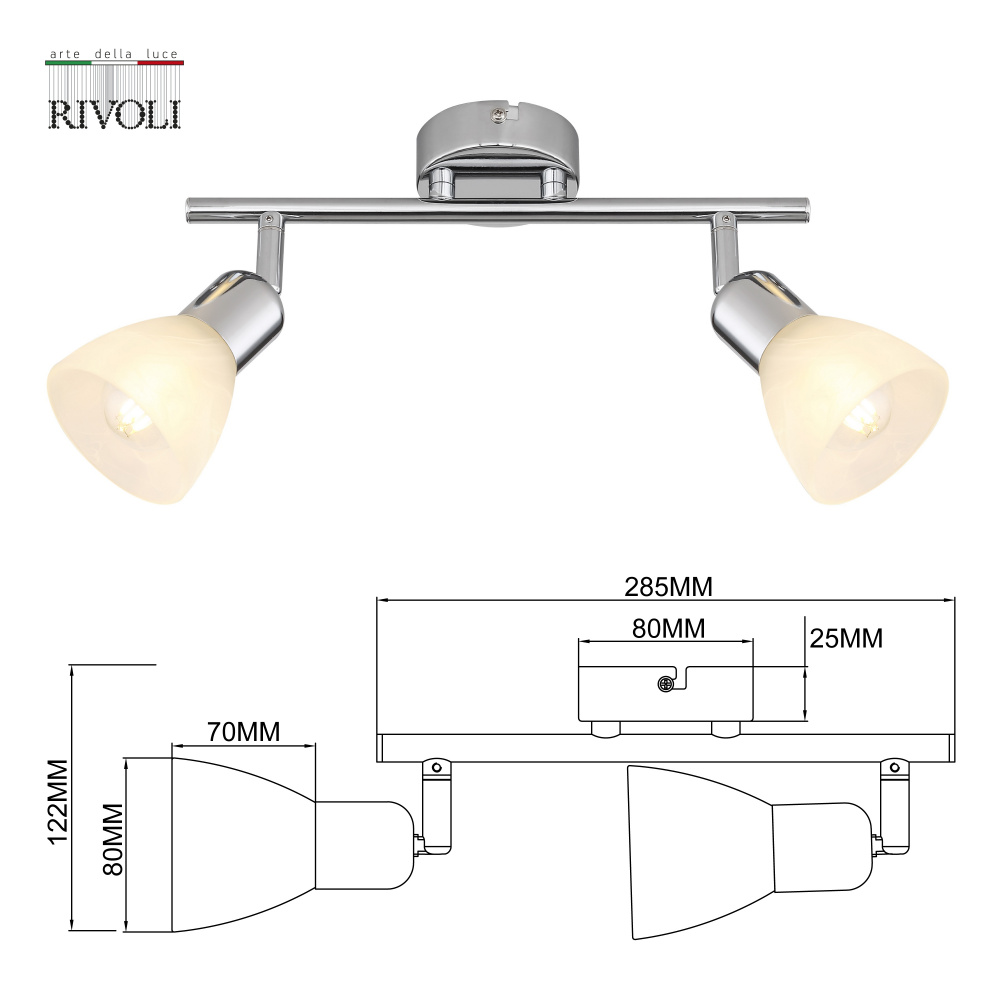Rivoli Keila (арт. 7051-702) - настенный светильник-спот с 2 поворотными плафонами. Имеет спокойный универсальный дизайн в светлых тонах. Такой спот поворотный хорош для традиционных, классических интерьеров. Споты настенные (споты потолочные) Keila станут удачным решением в качестве светильника в гостиную, светильника в детскую, светильника в спальню, светильника в прихожую, светильника в квартиру-студию. В любой момент вы можете отрегулировать направление света, повернув в нужную сторону плафоны данного настенно-потолочного спота.