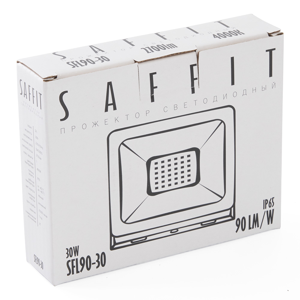 Прожектор светодиодный многоматричный с монтажным креплением на кронштейн, (ДО) SAFFIT SFL90-30, 30W, 4000К (белый), 230V/50Гц, 2700Lm, IP65, угол рассеивания 120°,*SMD2835, раб.t -40°C - +40°C, цвет чёрный, корпус алюминий литой под давлением + стекло, 117*92*27,5 мм