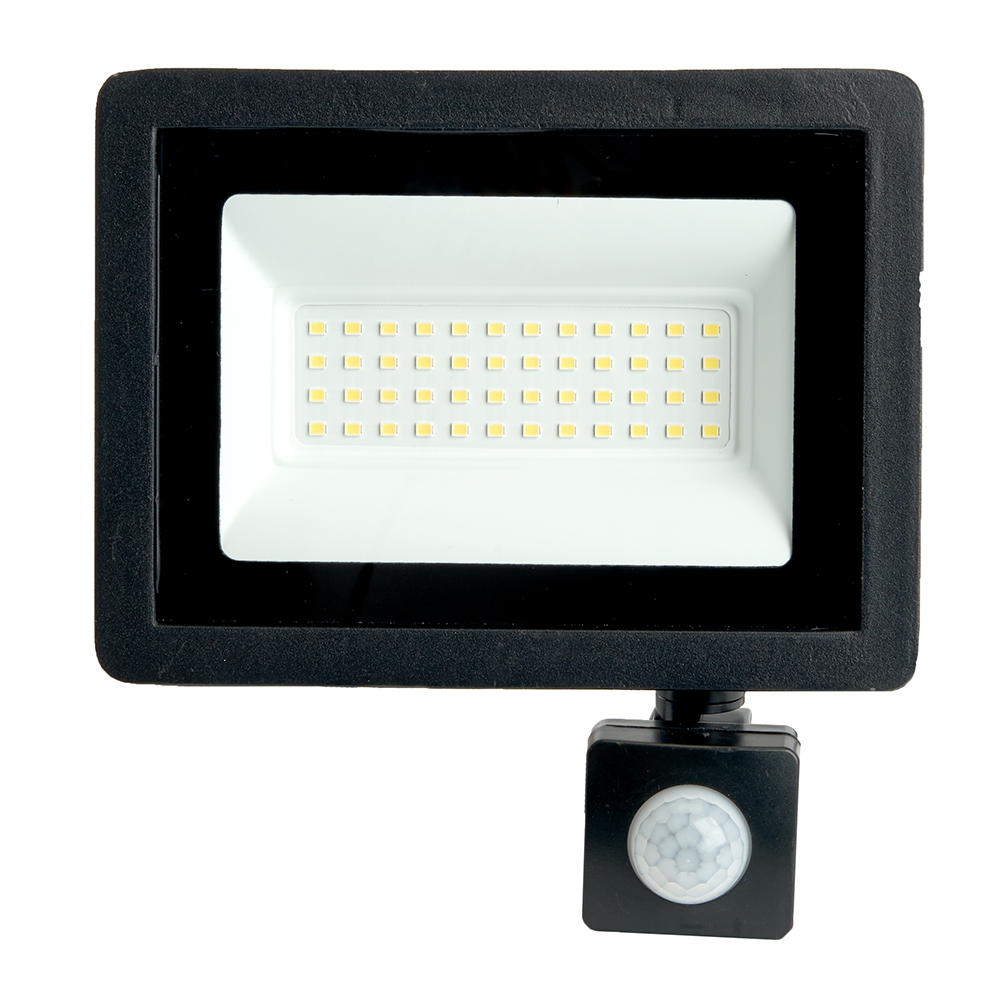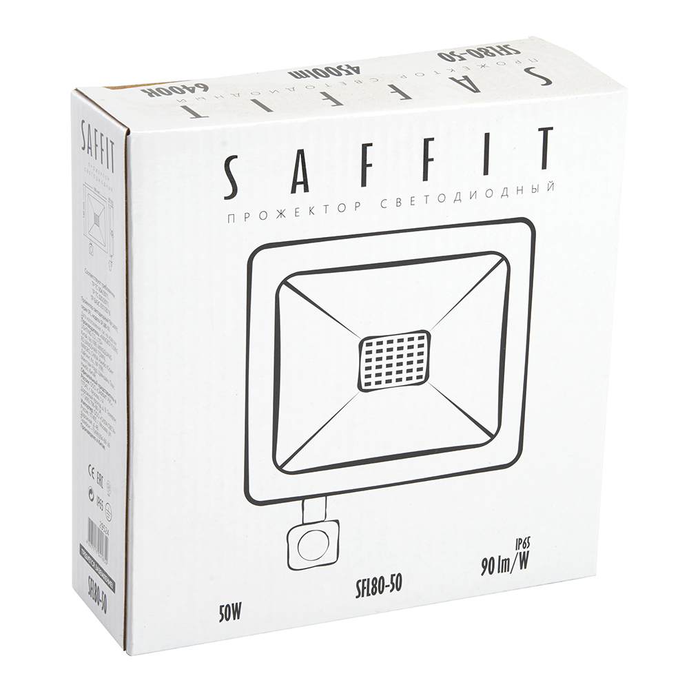 Прожектор светодиодный многоматричный с монтажным креплением на кронштейн, с инфракрасным датчиком движения (ДО) SAFFIT SFL80-50, 50W, 6400К (дневной), 230V/50Гц, 4500Lm, IP65, угол рассеивания 120°,*SMD2835, раб.t -40°C - +45°C, цвет черный, корпус алюминий литой под давлением + стекло, 190*140*50 мм