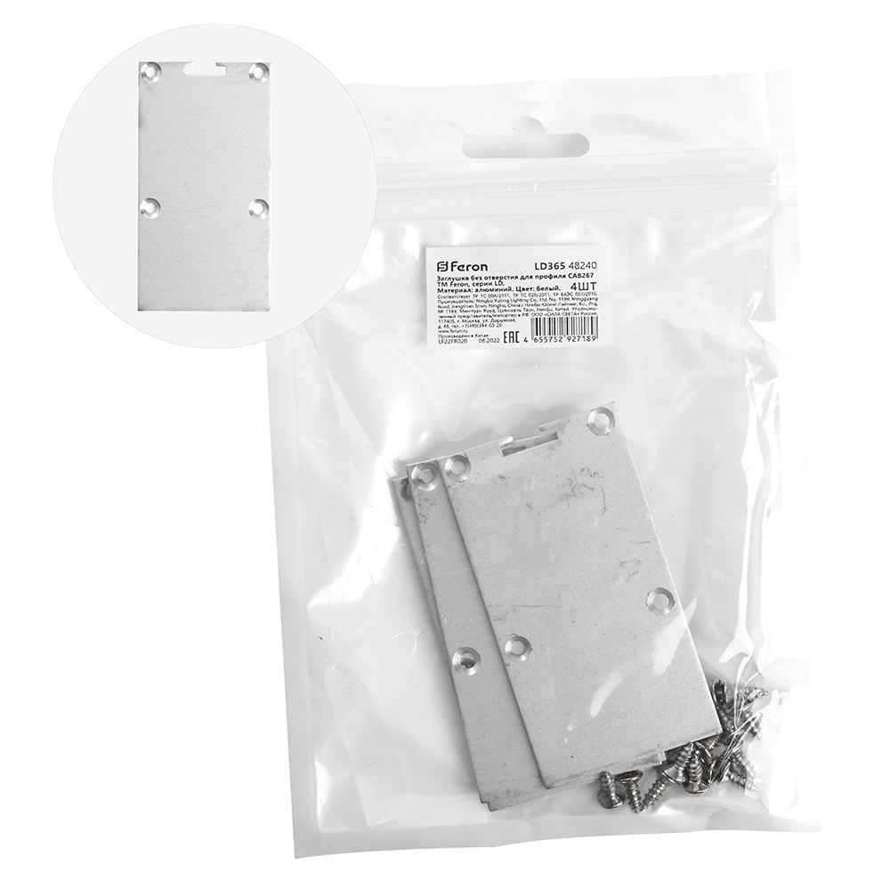 Заглушка для профиля FERON LD365 «без отверстия», цвет серебро, в комплекте 4 шт, 66*2*35мм