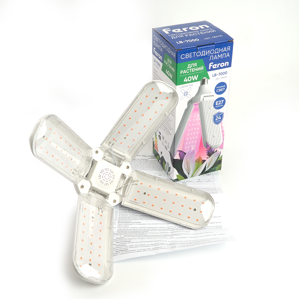 Лампа для растений FERON LB-7000 , (лепестковая), 40W 175-265V E27 (розовый), рассеиватель прозрачный угол рассеивания 180°, 240*95мм