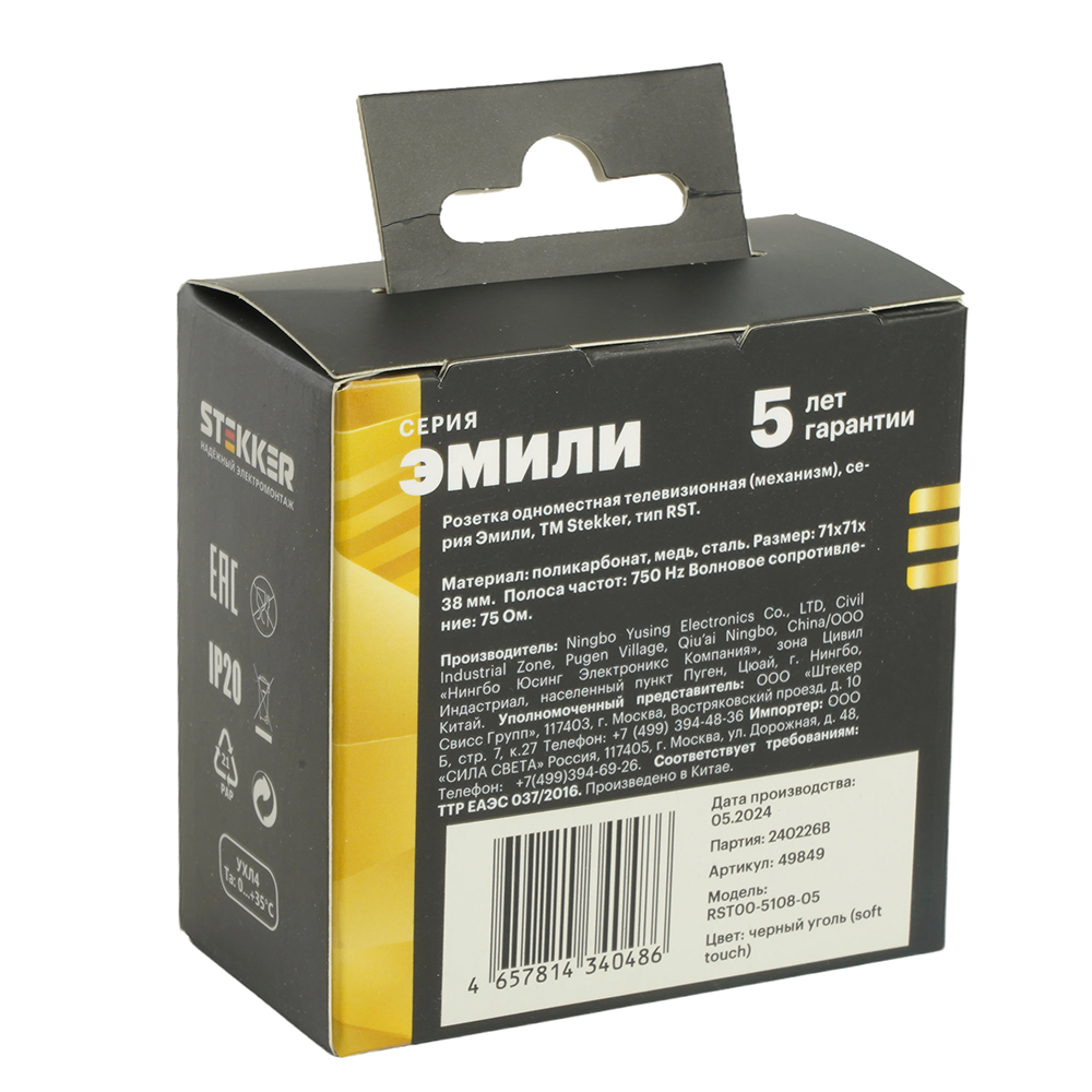 Розетка  STEKKER RST00-5108-05 (750 Hz) на 1 гнездо, -, -. Материал: поликарбонат, латунь, сталь, цвет черный уголь, soft touch, размер 71*71*38мм. Номинальное напряжение -, номинальный ток -, диапазон рабочих температур  0..+35°C, 20
