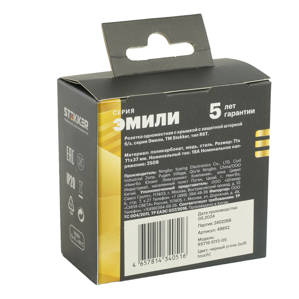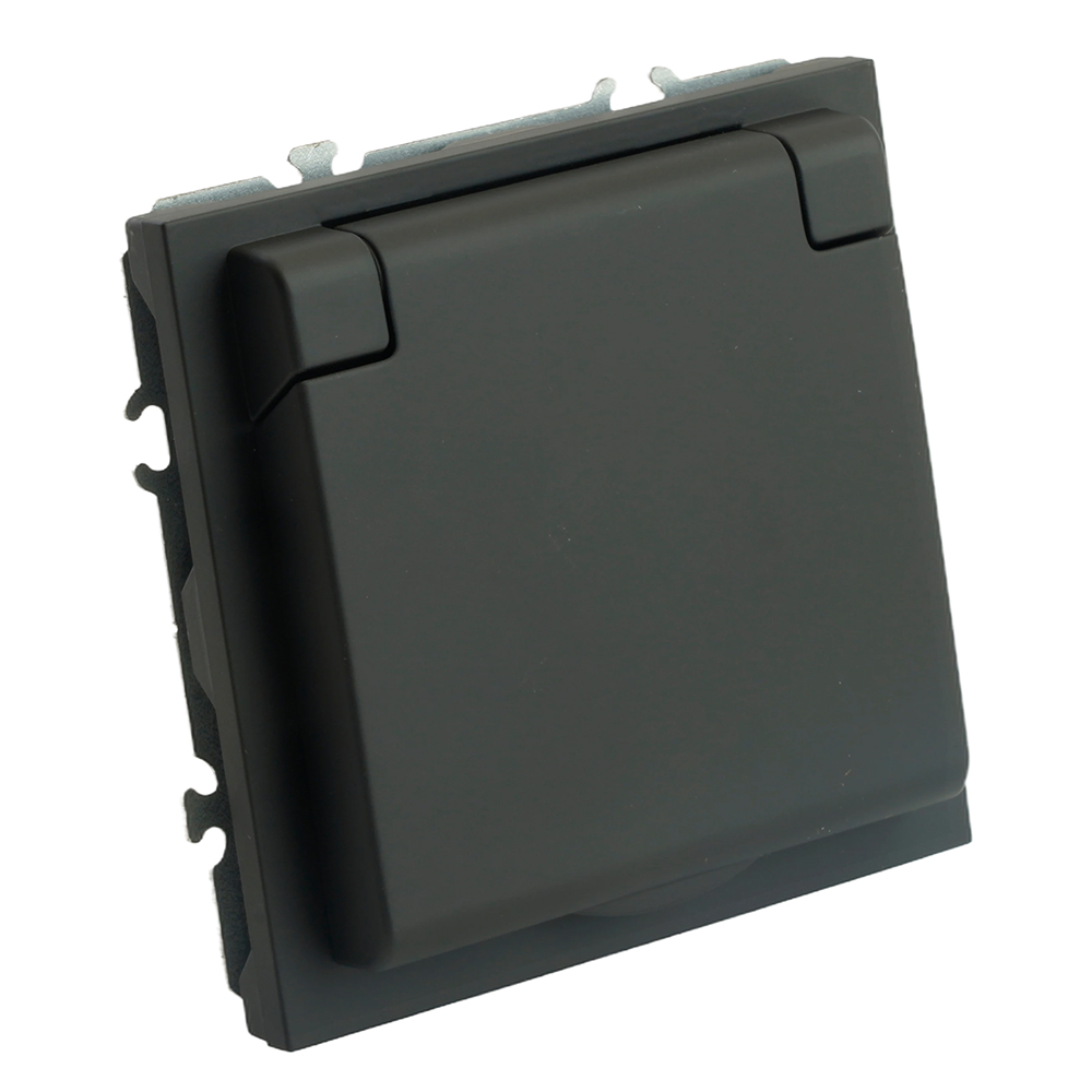 Розетка  STEKKER RST16-5113-05 на 1 гнездо, да, без заземления. Материал: поликарбонат, бронза, сталь, цвет черный уголь, soft touch, размер 71*71*37мм. Номинальное напряжение 250, номинальный ток 16А, диапазон рабочих температур  0..+35°C, 42