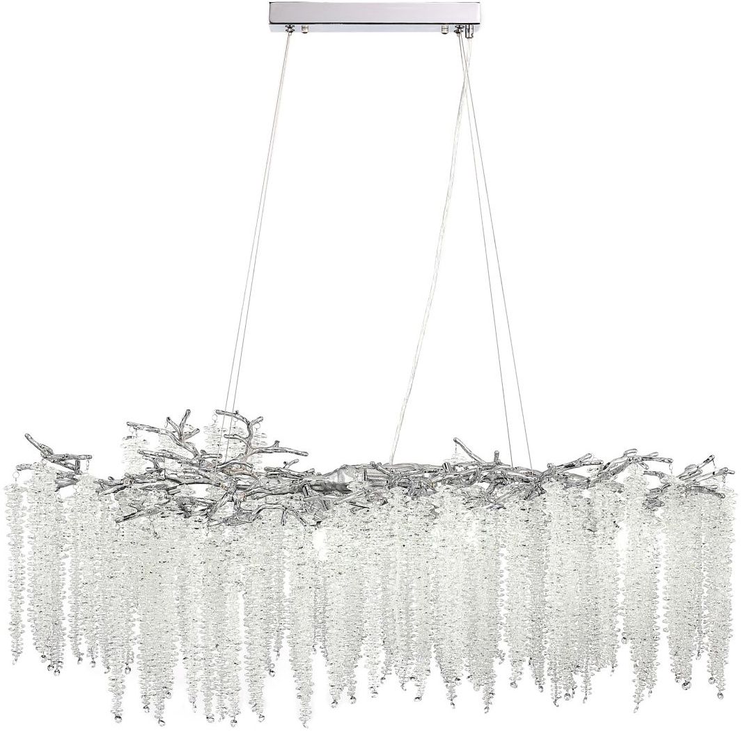 Люстра подвесная вытянутой формы коллекции Eiva / Эйва выполнена из сплава алюминия, гальванизирована в цвет хрома и декорирована гроздьями из хрусталя в форме октагон. Светильники коллекции отличает увеличенное количество хрусталя (120 хрустальных гроздьев), фактурная чеканка на потолочной чаше и лампы с цоколем Е14. Из данной коллекции светильников можно сделать индивидуальный заказ любого цвета и размера.